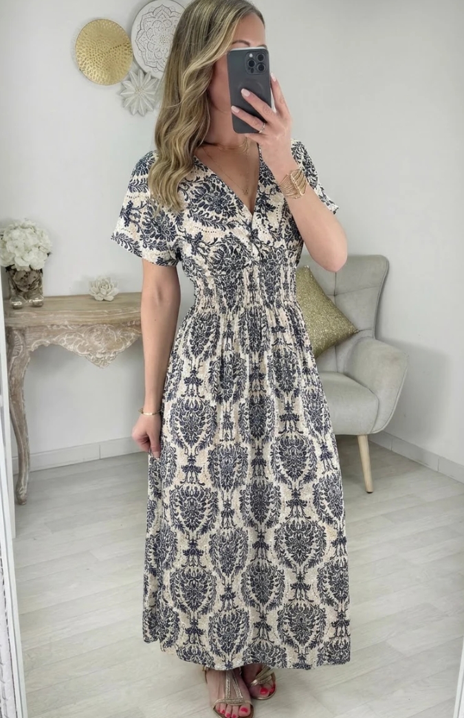 De jurk heeft een elegante v-hals, een vrouwelijke pasvorm en een luchtige, zwierige rok – perfect voor een dagje uit, vakantie of een feestje. Combineer met sandalen of hakken en je bent meteen klaar om te stralen! ✨